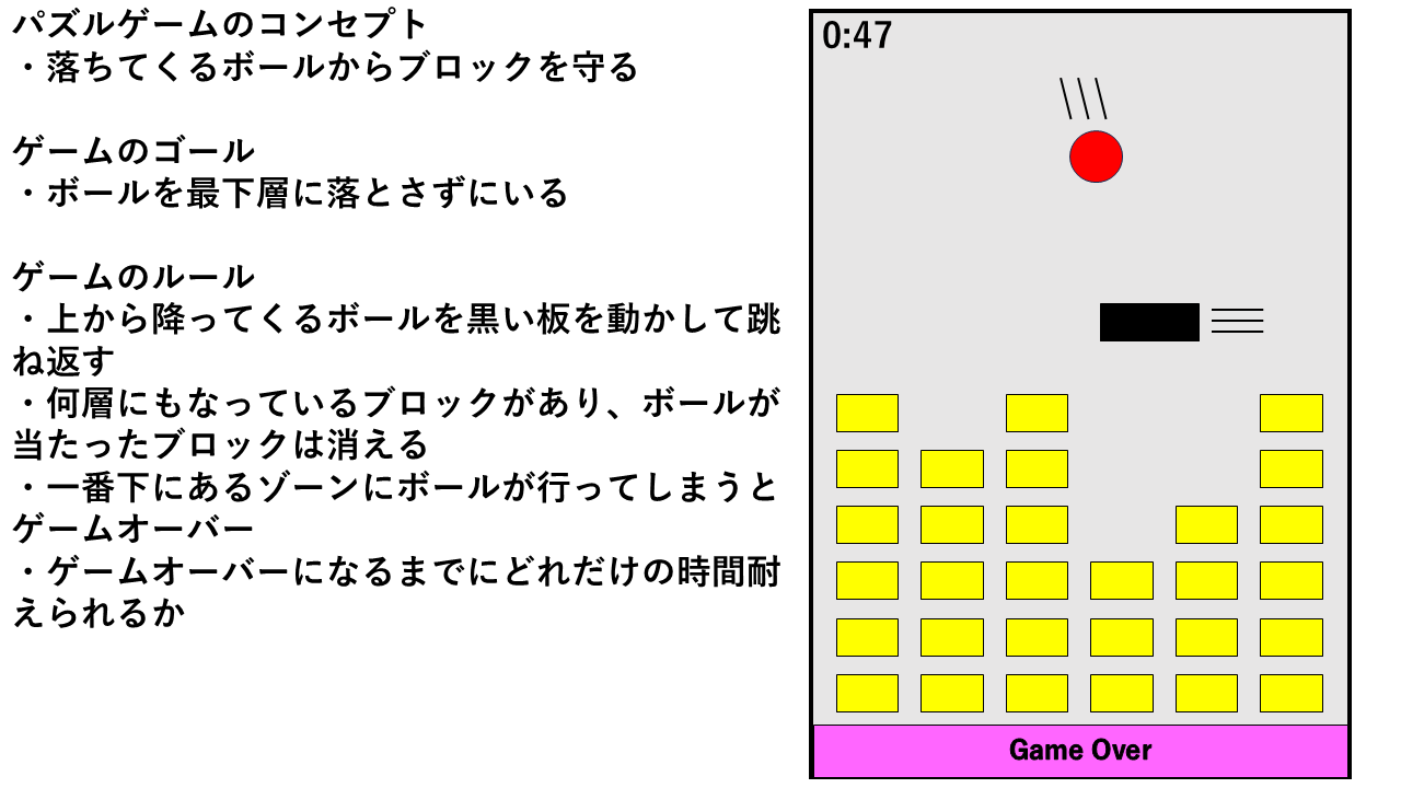 ゴール:ブロックが消え、ボールが一番下に到達したらゲームオーバー
